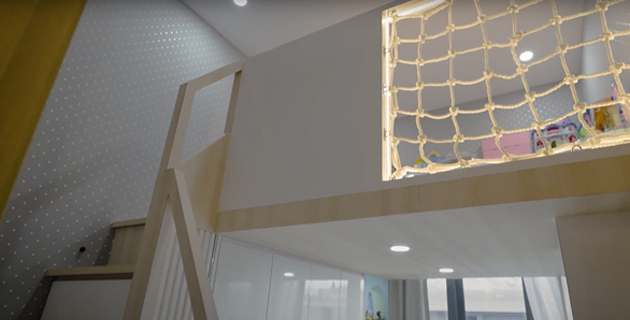 In units with high ceilings, creating a loft bedroom becomes possible. The talented team at Magnificent Living Concept harnessed their imagination to create a magical space for the children. A closet and desk beneath the bed maximises the functionality and minimises the use of floor space. The rope wall is a fun way to transform this space into a whimsical fortress. It also makes the upper deck easily visible from below, for the parents to check on their child, and keeps the ceiling light unblocked in the entire room.
